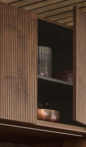 The gaps between the upper cabinet and the ceiling are typically closed with a horizontally running ceiling panel. By extending the doors, this horizontal element is eliminated, and the vertical joints of the cabinets form a smooth transition to the ceiling.